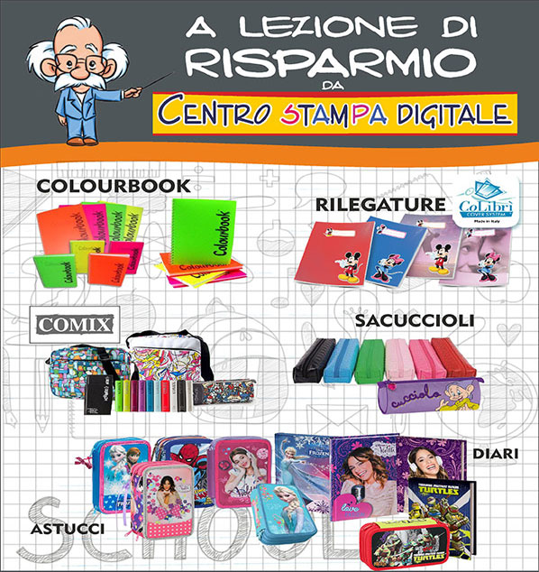 A ogni inizio di anno scolastico (ma anche durante l'anno) proponiamo tante offerte speciali per il corredo scolastico, un ampio assortimento per soddisfare ogni esigenza.